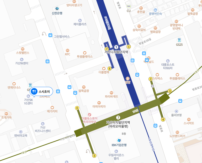 스시초이는 가산디지털단지역 6번출구 바로 앞의가산SK V1센터 건물 2층에 있어요!