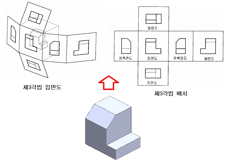 ★Point : 제3각법에서, 우측/좌측면도 바꾸고, 평면/저면도를 바꾸면 됨